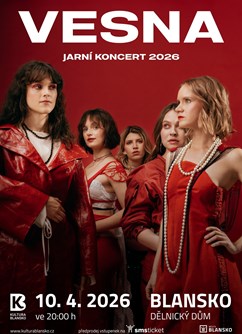 Vesna se uskuteční dne 2026-04-10 v 20:00 v Blansko, Dělnický dům.🎟️ Koupit vstupenkuVesna je čistě ženská slovanská kapela, žijící v České republice, která kombinuje moderní pop music s prvky folklóru.VESNA...