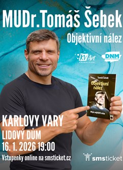 MUDr. Tomáš Šebek: Objektivní nález se uskuteční dne 2026-01-16 v 19:00 v Karlovy Vary, Lidový Dům.🎟️ Koupit vstupenkuSrdečně Vás zveme na besedu 16.1. od 19:00 do Karlových Varů s názvem: MUDr. Tomáš Šebek: Objektivní nález. Uznávaného chirurga můžete znát hlavně jako účastníka misí "Lékaři bez hranic". Po besedě bude odpovídat na veškeré Vaše dotazy, vyfotí se...
